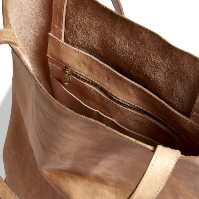 Super cool tote in natural leather with pocket inside with a zipper and 2 open pockets