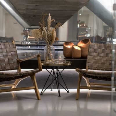 The furniture is sustainable design in certified teakwood and cowleather perfect for daily living rooms, halls, bedrooms and lounge environments in restaurants and hotels. It is an exclusive design with beautiful details that gives a cool and sophisticated look.